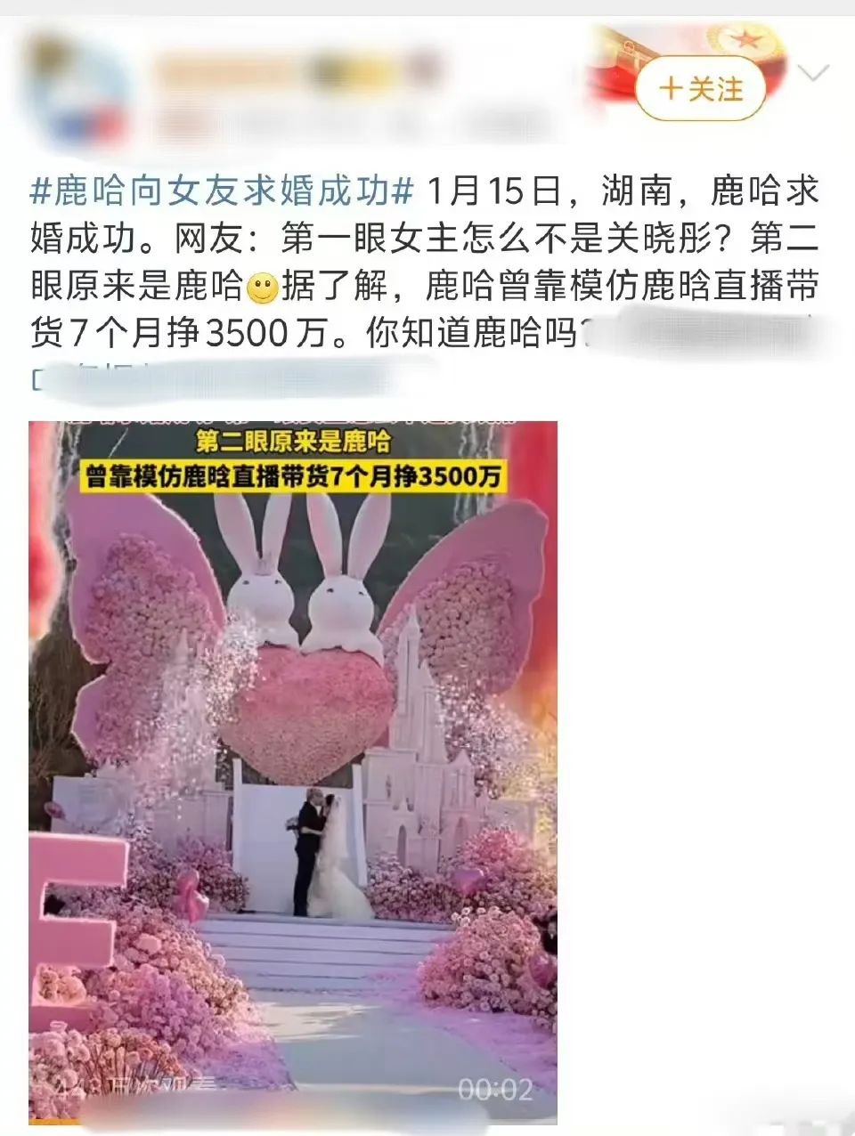 近日看到一条“鹿哈向女友求婚成功”的词条上了热搜,很多眼花的网友们,都是不明所以地点进去,最后骂骂咧咧地出来,都以为是鹿晗向关晓彤求婚了,没想到是一个模仿鹿晗而走红的网红鹿哈的求婚视频,也因为他屡次蹭热度的行为引发了很多争议。